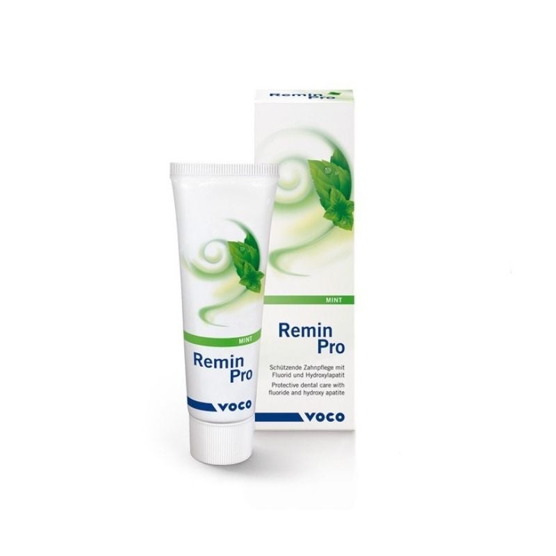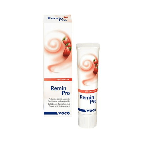 Voco Remin Pro on vesipohjainen voide joka sisältää Hydroksi-Apaattia, Natriumfluoridia (fluoridipitoisuus 1450ppm) ja Xylitolia.