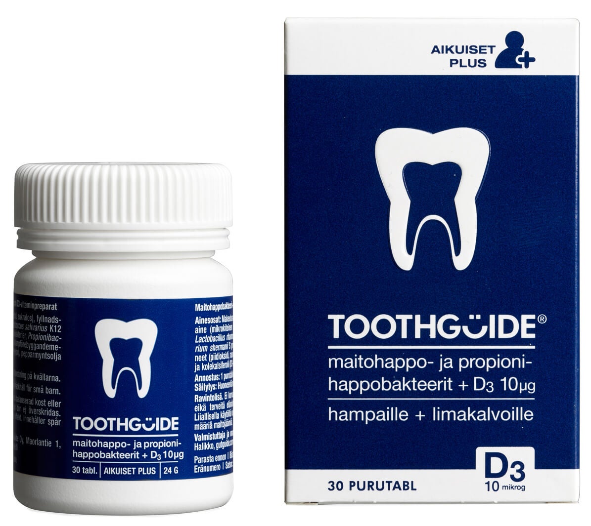 ToothGuide Aikuiset Plus -purutabletit ovat hampaiden hyvinvointia ja immuunijärjestelmän normaalia toimintaa edistäviä maitohappobakteerivalmisteita. Tabletit sisältävät suusi luonnolliseen mikrobistoon kuuluvia Streptococcus salivarius -maitohappobakteereja, ksylitolia ja D3-vitamiinia. ToothGuide-valmisteita voit käyttää osana päivittäisitä hammas- ja suuhygieniaasi.
