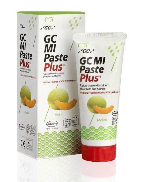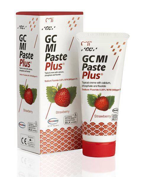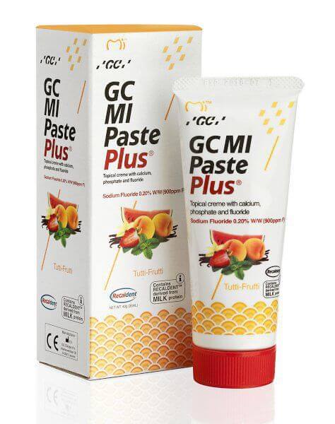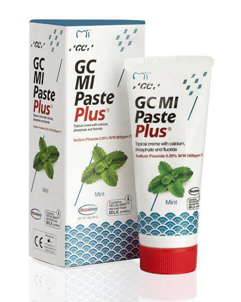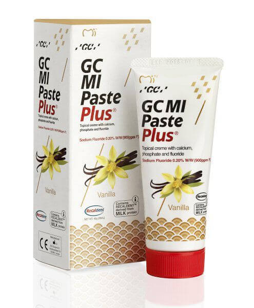 GC MI Paste Plus sisältää kaikki GC Tooth Moussen edut ja kaupan päälle 900 miljoonasosaa (ppm) fluori-ioneja. Nämä ionit ovat tunnettuja remineralisoivista, hampaitasi hoitavista ominaisuuksistaan ja MI Paste Plus onkin ainoa tuote, joka takaa ihanteellisen kalsiumin, fosfaatin ja fluorin suhteen 5:3:1. Tämän vesipohjaisen, sokerittoman pastan GC MI Paste Plussan tärkein vaikuttava aine on Recaldent™ (kaseiinifosfopeptidi-amorfinen kalsiumfosfaatti), joka on maitoproteiini kaseiinin johdannainen. Jo vuosia on tiedetty, että maidolla ja sen johdannaisilla on hampaita suojaava vaikutus. GC MI Paste Plussa yhdistettynä Recaldentiin™ on täydellinen yhdistelmä suojaamaan koko suutasi!