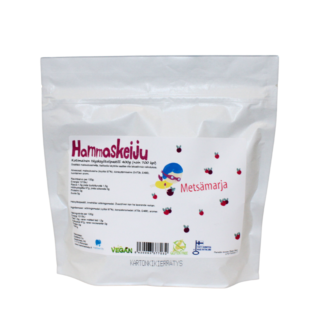Hammaskeiju vie sinut makumatkalle kesäiseen metsään. Metsämarjoilta maistuvat täysksylitolipastillit poimit suuhusi helposti kuin auringon lämmittämältä mättäältä puolustamaan hampaitasi happohyökkäyksiltä ja metsän ilkeitä menninkäisiä muistuttavilta bakteereilta. Hammaskeiju Metsämarja -ksylitolipastillit sopivat kaikkiin ruokavalioihin, sillä ne eivät sisällä liivatetta tai eläinperäisiä ainesosia.