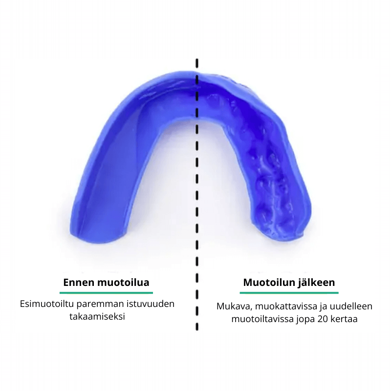 Sisu 3D -hammassuojan voi muotoilla kotona helposti, ja se istuu hampaisiisi täydellisesti ilman hammaslääkärikäyntiä! Jos sinulla kuitenkin on oikomishoidon hammasraudat, muotoile hammassuoja hammaslääkärin avustuksella, jotta suoja istuu mukavasti. Ei siis enää huolta siitä, etteikö hammassuojasi pysyisi paikallaan tai tuntuisi epämukavalta. Tämä Sisu 3D -hammassuoja on suunniteltu sinun mukavuuttasi ja turvallisuuttasi ajatellen.